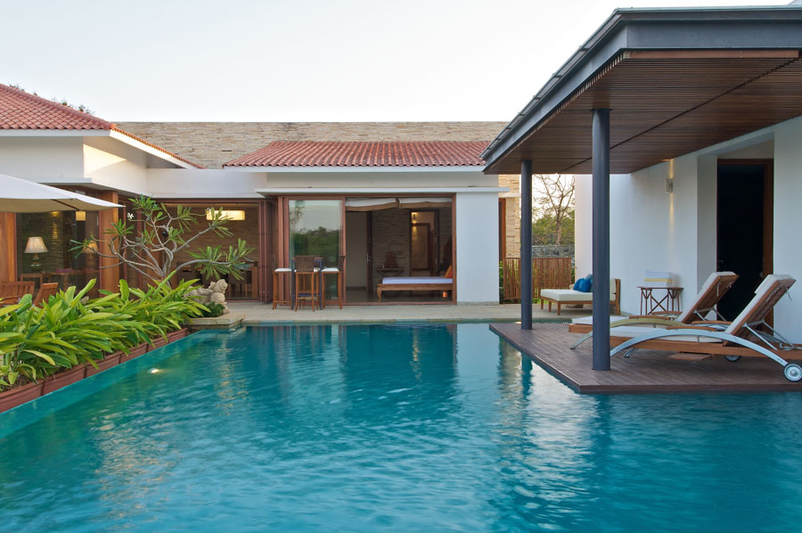 Nothing feels more tropical and can transport you as quickly into a vacation mood as a home design with swimming pool. A tranquil swimming pool design for a home can create a zen environment for the whole family or when entertaining guests. Even when not in use, your swimming pool can help enhance the view or ambience of a space as an infinite still sheet of azure with not a ripple of imperfection in sight. To add to the tranquil feeling, consider adding a sculpture or the bust of Buddha (as seen to the left of the swimming pool design in this picture) or any other symbol that evokes in you a similar relaxing emotion.