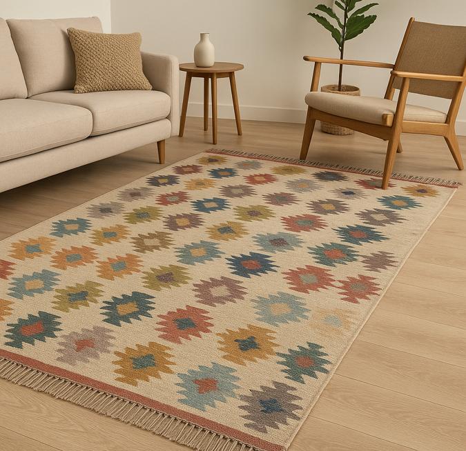 In the spirit of vibrant hues, meet "Rangmani," a Dhurrie rug crafted from Jute. Like a kaleidoscope of joy, its cloud white base and autumn purple border weave a symphony of colors. The geometric design mirrors life's intricate patterns, much like the varied experiences that paint our journey. "Rangmani" invites you to step onto a canvas where every color and shape tells a story, turning your space into a gallery of life's beautiful moments. This is a Medium size rug with dimensions as follows: 7' 9 x 4' 9 ft.