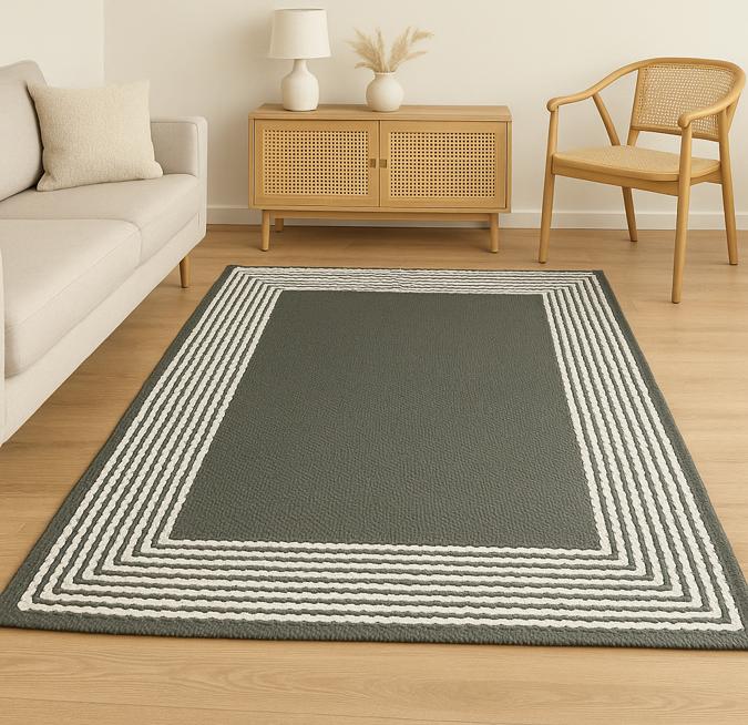 Crafted in the elegance of sage green and adorned with a pristine white concentric border, the ASHLEY rug’s cotton threads, woven with precision, create a texture that not only adds volume but also depth to its exquisite design, inviting you to sink your toes into its luxurious embrace. This is a Small size rug with dimensions as follows: 5' 9 x 3' 9 ft.