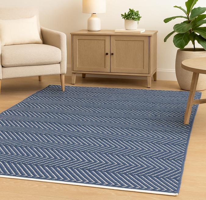 Imagine a lazy summer afternoon, where sunlight filters through sheer curtains, casting playful shadows upon your EMBREN rug adorned floor. Each indigo and creamy white chevron, a whisper of the ocean's embrace, invokes a sense of timeless beauty and fluid grace, seamlessly merging with modernity. This is a Small size rug with dimensions as follows: 5' 9 x 3' 9 ft.