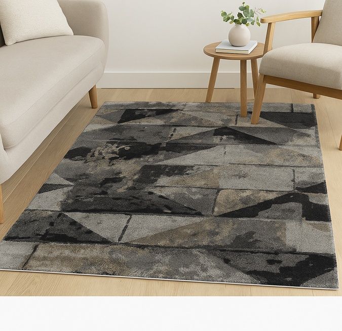 From functionality to becoming a work of art, the CALYPSO rug’s eclectic contemporary design, adorned with triangles and rectangles, dances gracefully in a mesmerising fusion of black olive and ashwood hues. Pair it with a monochromatic colour scheme in your living room or study, and watch as it transforms the ordinary into the extraordinary. This is a Small size rug with dimensions as follows: 5' 4 x 3' 4 ft.