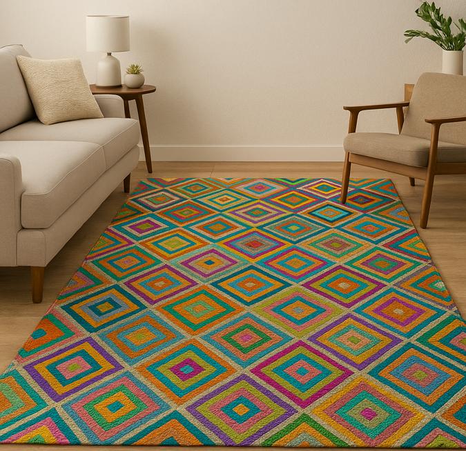 Bold and unabashedly unique, the DAFFODIL rug ignites your space with a burst of energy, leaving a trail of wonder in its wake.As you traverse a kaleidoscope of imagination within its concentric diamond patterns, each hue becomes a brushstroke in the canvas of your home and an invitation to spark conversations. This is a Small size rug with dimensions as follows: 5' 4 x 3' 4 ft.