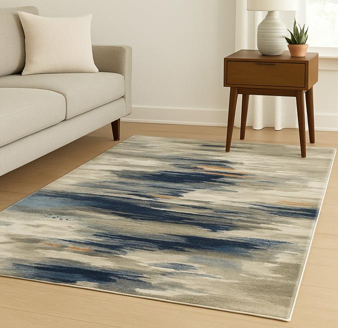 With each wave pattern delicately crafted, the MIRAGE rug weaves tales of the boundless sea and the endless sky with its soft ashwood and stormy blue hues. As you walk upon its hand tufted soft surface, feel the calm embrace of the sea and sky, intertwined in a dance of tranquillity. This is a Medium size rug with dimensions as follows: 6' 9 x 4' 9 ft.