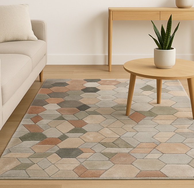 The MOSAIQUE rug marries hexagons and cubes, reminiscent of ancient mosaics, yet breathing with a contemporary flair. As your eyes wander across its surface, you're greeted by a multi-hued optical illusion created with classic grey intertwined with the delicate hues of light coral and rust. This is a Small size rug with dimensions as follows: 5' 4 x 3' 4 ft.