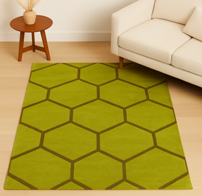 Like a secret garden unfurling at your feet, the hand-tufted TISHANE rug brings the lush hues of wild lime into your living room. The dark grey honeycomb design is a tribute to the intricate homes of woodland creatures and the magic of wilderness weaving its spell throughout the space. This is a Small size rug with dimensions as follows: 5' 4 x 3' 4 ft.