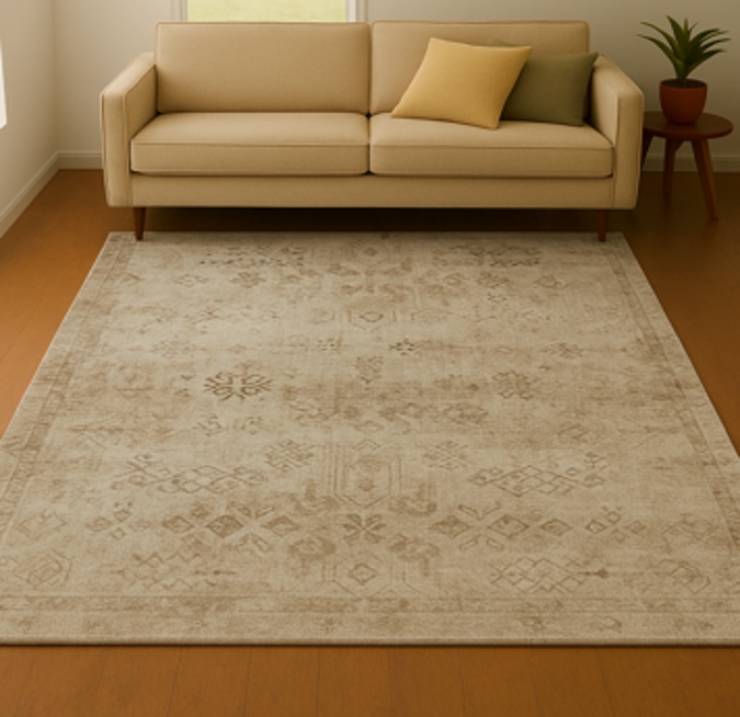 KAVIR rug is a composition of soft, sunwashed shades and intricate geometric florals that dance upon a canvas of cream beige, seamlessly blending with the grandeur of classical interiors or the sleek lines of modern abodes. This is a X Large size rug with dimensions as follows: 9' 5 x 6' 6 ft.