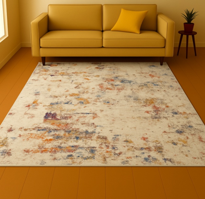 Reminiscent of the sun's gentle descent over earth’s terrain, the warm tones of TERRA rug speaks of fireside gatherings and cherished moments and establishes an innate connection between humanity and the earth, a reminder of our shared heritage and interconnectedness. This is a Small size rug with dimensions as follows: 5' 9 x 4' ft.