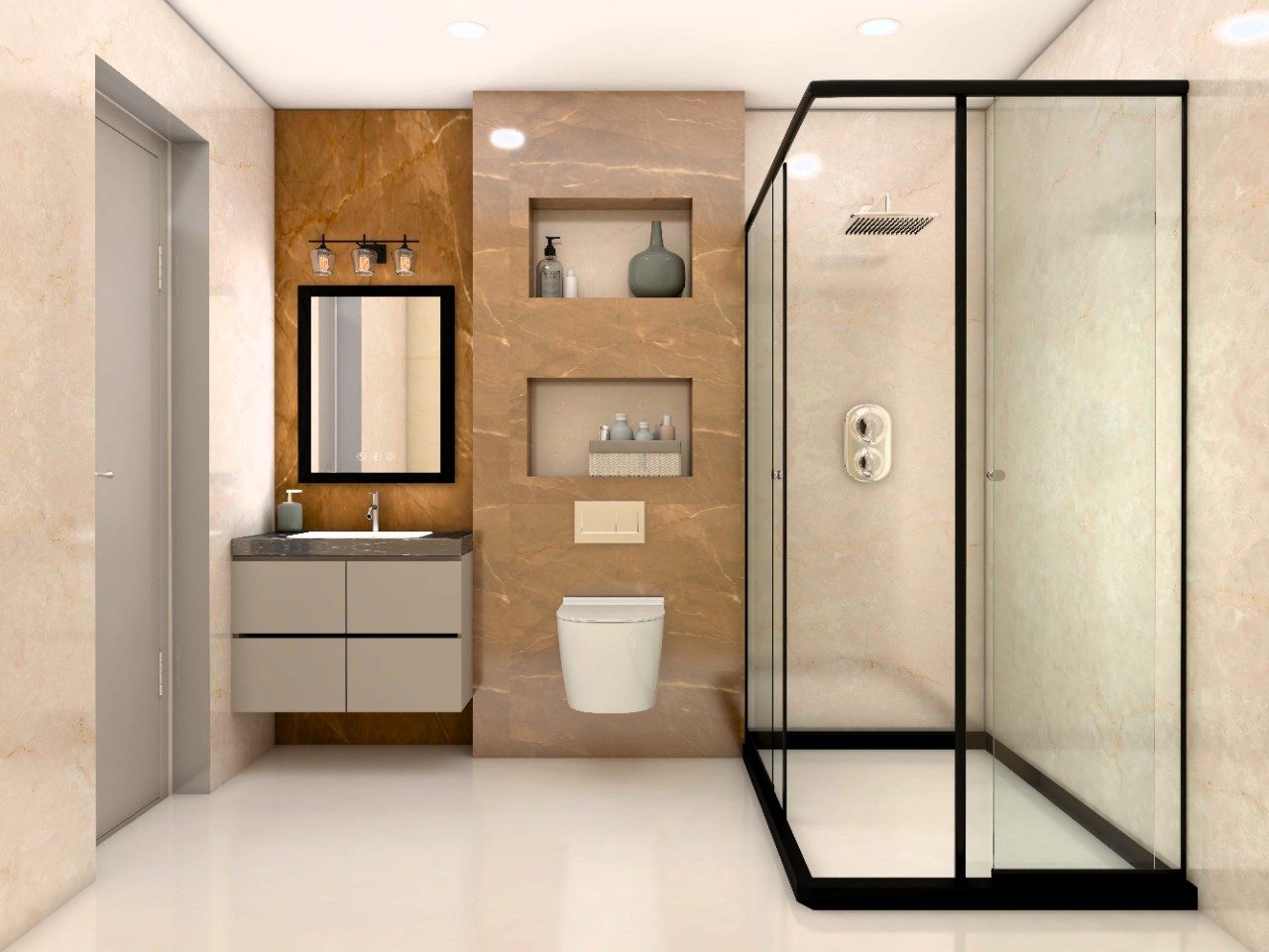 This 1BHK design blends modern aesthetics with functionality, featuring a stylish bathroom with geometric tiles and gold-accented lighting, a serene bedroom with deep green wardrobe panels and cozy pendant lights, and a chic kitchen balancing dark and wood-finish cabinets. The living room exudes sophistication with damask wallpaper, warm beige sofas, and gold-toned lighting, creating a refined yet inviting atmosphere.