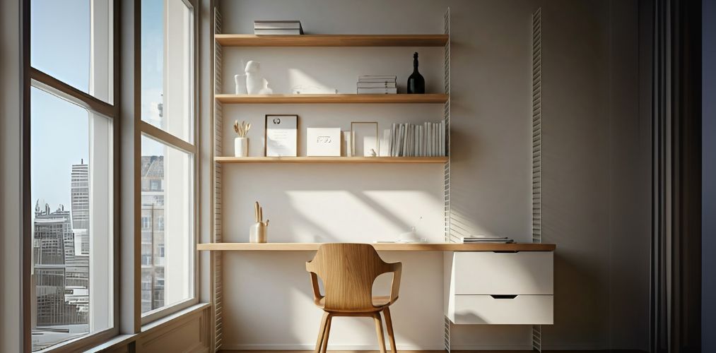 Scandinavian study room with open floating rackst