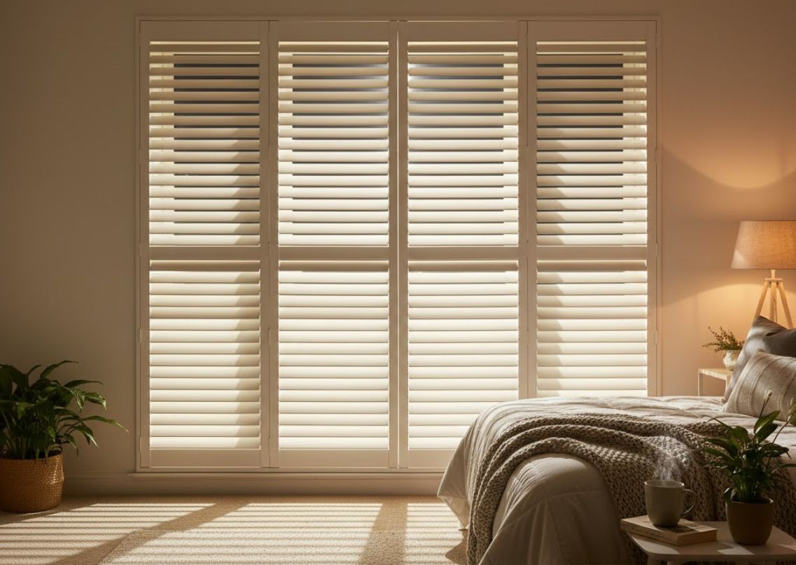 This modern bedroom showcases a serene ambiance with white window shutters that softly filter sunlight, creating an inviting glow. The neutral colour palette harmonizes with cozy textiles and a stylish bedside table with a warm lamp. Indoor plants add a refreshing touch, complementing the natural lighting and soft textures, making the space both calming and elegant.