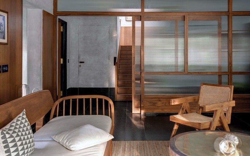 Inspired by nature, a lot of natural finishes and colours are seen in the house. Wooden finishes dominate the material palette, along with a concrete-like finish on the walls and ceilings, made using Asian Paints Stucco Marmelano. This has been done to create an earthy look. Little pockets of green come in through indoor plants. This way the calmness of the natural elements surrounding the house continue inside it as well.