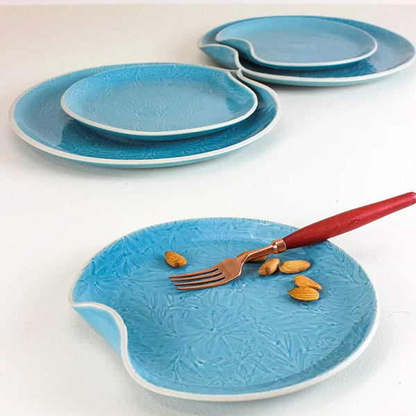 Giving a fun twist to simple pottery, this brand adds colour and patterns to the otherwise earthy finish. The dessert plate here is a perfect example of how to add some cheer to your table.