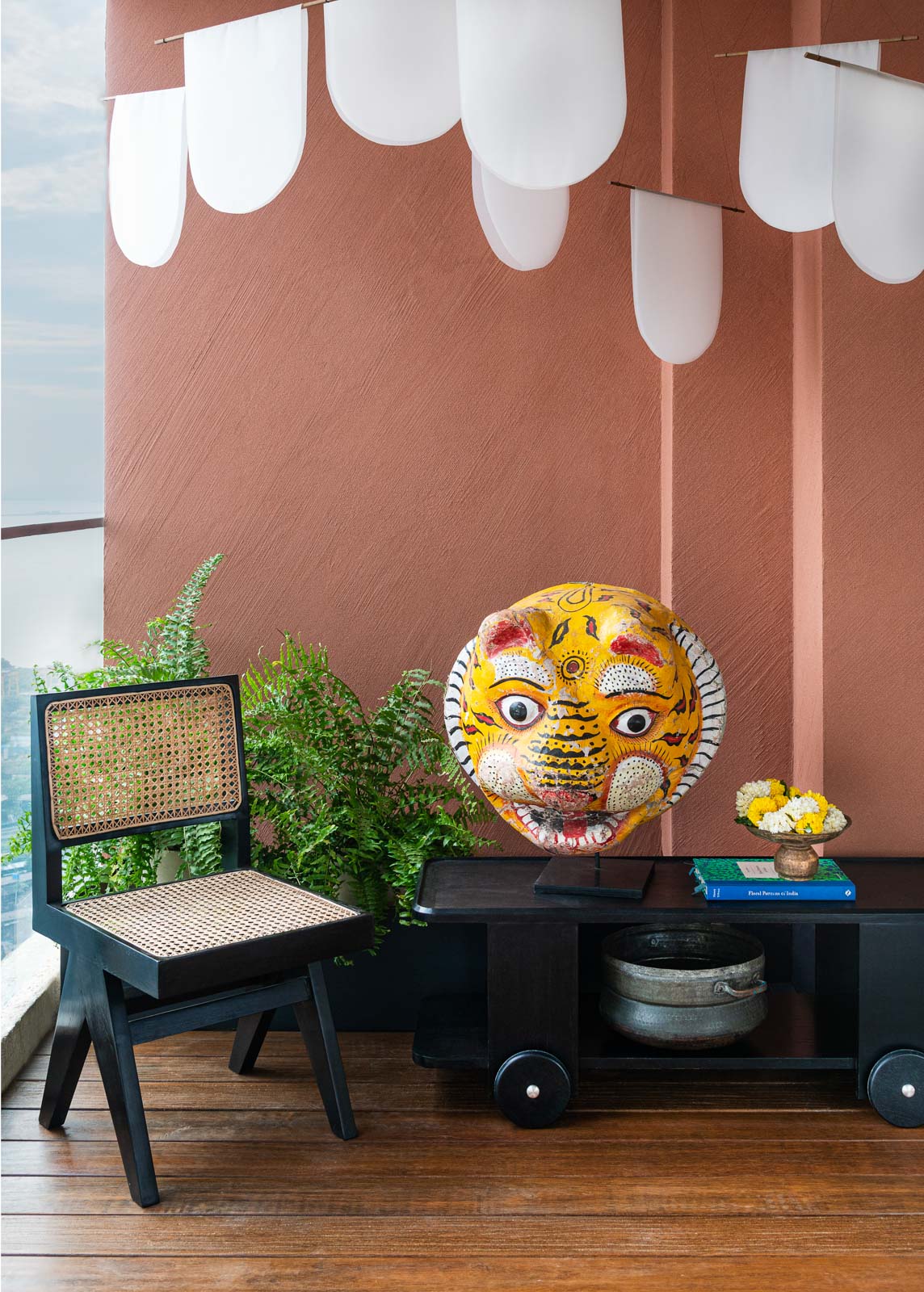 Here, I’ve chosen a few rustic elements that still work with a contemporary space like a tiger head, mask and cow figurine from Philips Antiques. I’ve added a beautiful Chandigarh Chair in dark wood and cane that brings out that vintage vibe. The side table on wheels is a new design we are working on in our studio. This carefully curated blend of rustic and vintage elements not only complements the contemporary ambiance, but also showcases the seamless integration of different design styles, creating a captivating and unique Interior Design composition."