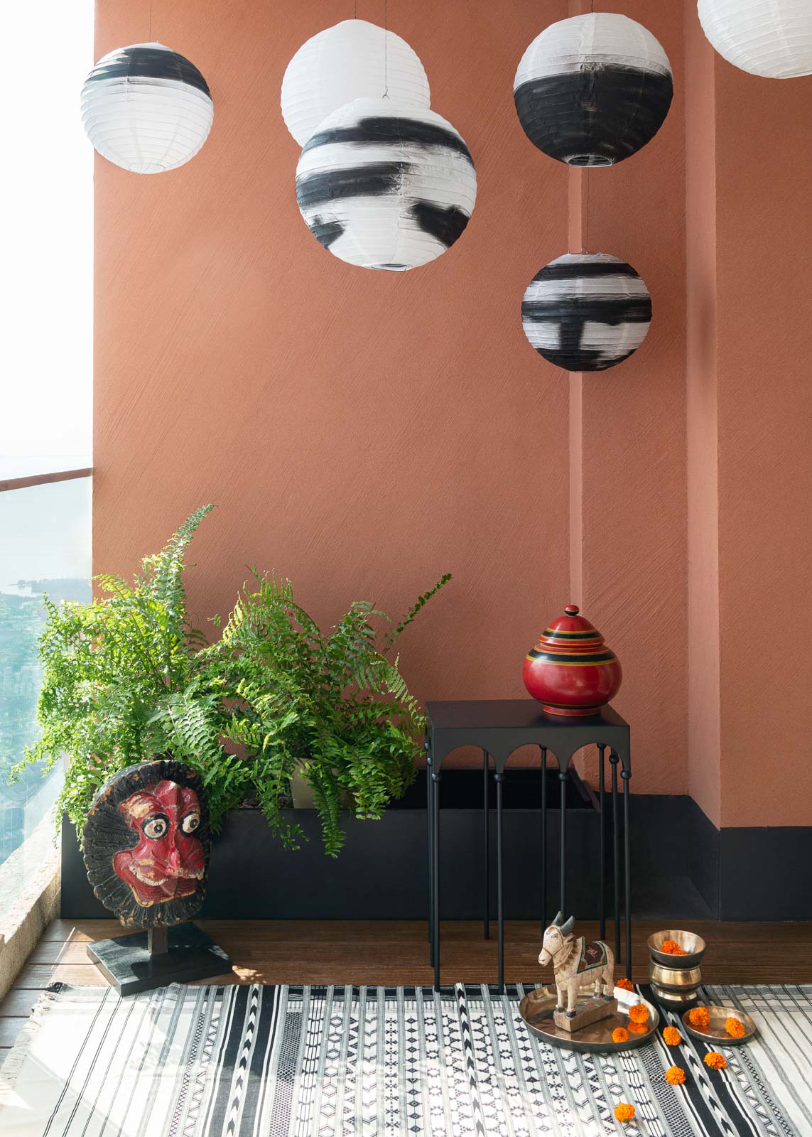 Mangesh says, “The driving force of the look I have styled is the colour and texture of the wall, which can be a perfect canvas for layering other elements while still being a standout feature. I’ve used Asian Paints Ultima Allura Graniza exterior paint in a Fine Finish texture topped with their Tile Guard Clear Matt Topcoat. I felt a deep connection with the terracotta; it takes me back home. The diagonal texture, at an angle of 45 degrees, adds beauty and visual interest. It’s a simple expression that is very effective. If possible, bring in hardwood flooring as well - the wood grain adds to the visual texture while being a neutral canvas for the other pieces. If you choose the right wood and maintain it properly, it will last a lifetime. I’ve used the Asian Paints Woodtech Emporio PU clear finish to polish the floors.”