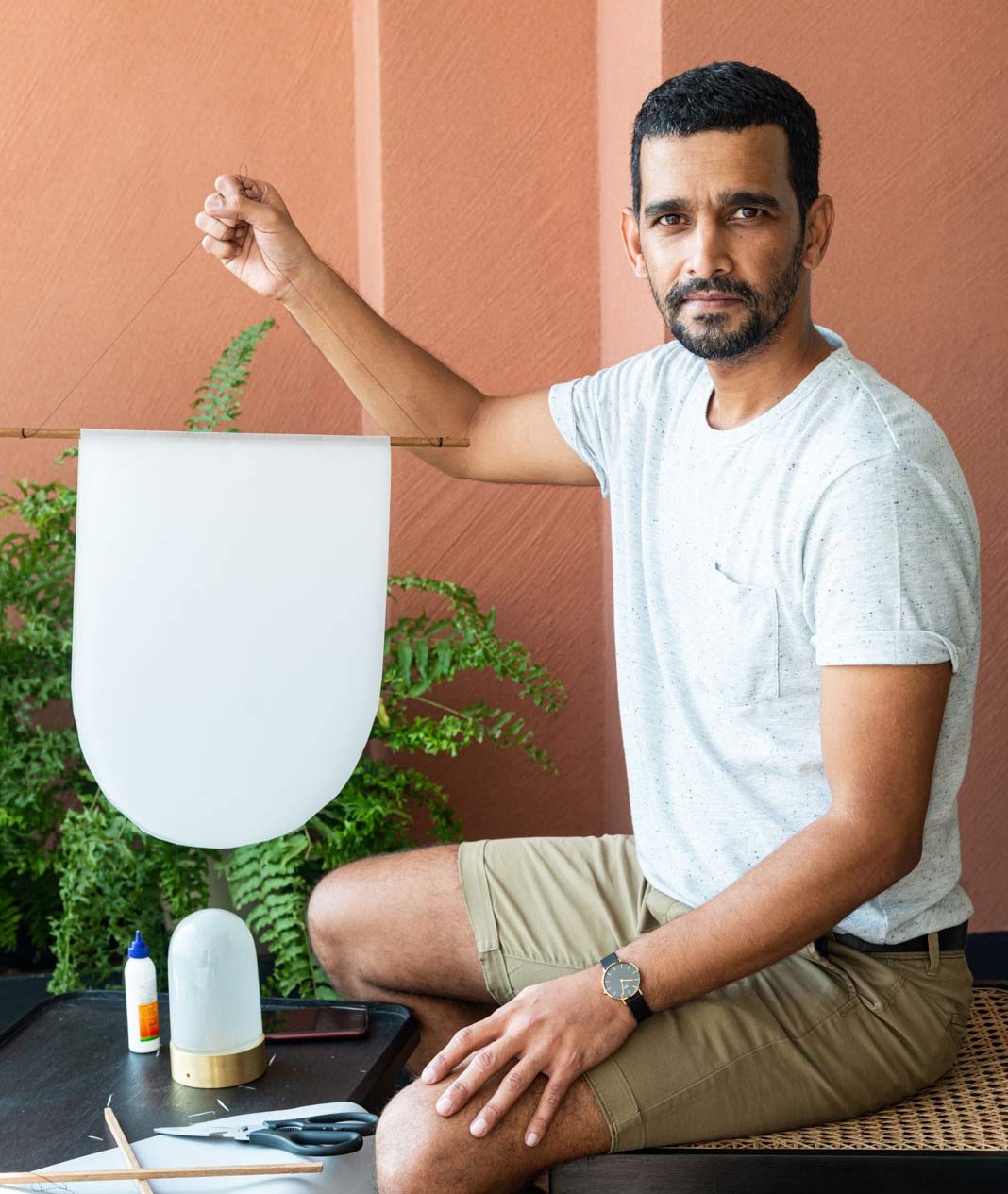 I have crafted these DIY delicate hanging light features which gently sway in the breeze, my rendition of festive lanterns that remind me of temple bells. I’ve used paper cut-outs glued around thin bands of wood with LED strips to illuminate each piece. I added rough paint stroke to the paper globes to give each a different look and then hung them from the ceiling at different heights with thin wire. So, during the day they softly sway in the breeze, and at night the gently illuminated installation creates a pleasing vibe.”
