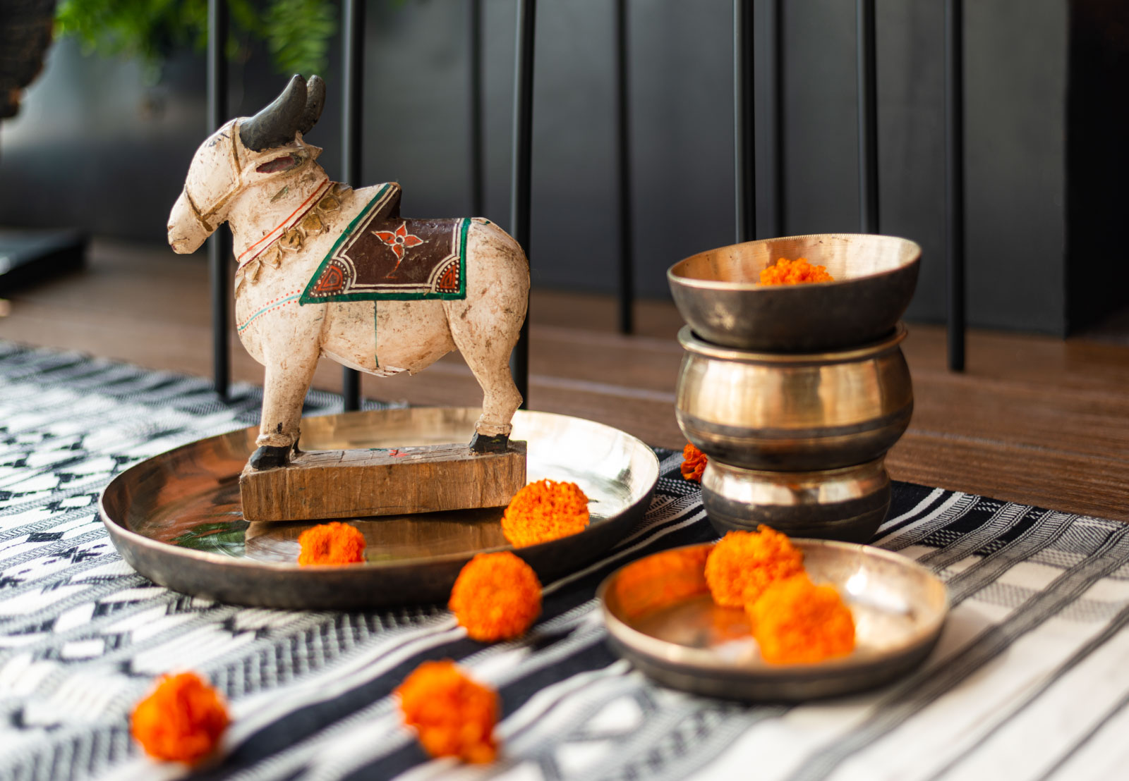 “Add a pretty rug to the mix. You can fashion comfortable floor seating around it for a house party. Another element that screams Diwali to me is brass - from planters and vases to curios and thalis filled with garlands, bring in some brass pieces to add a traditional element to the space.
