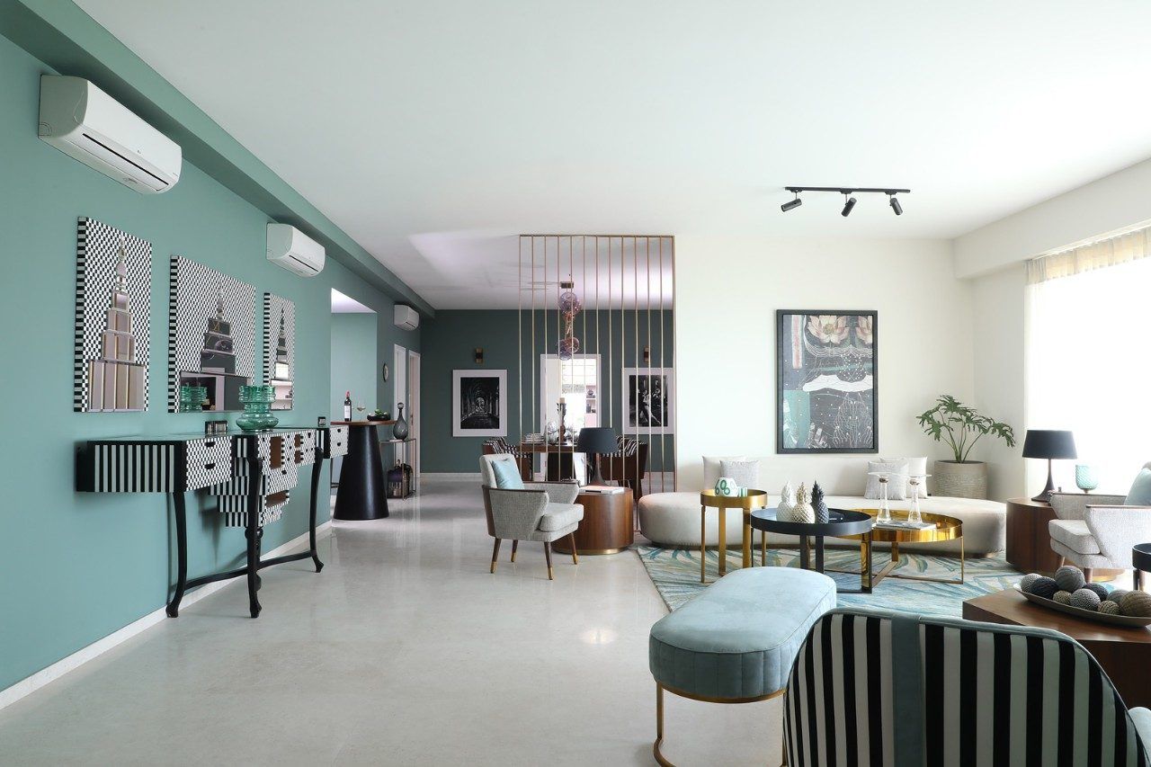 Recently, DLF5 unveiled its four sample show flats for DLF Crest and we can’t help but admire their warm, home-like quality. While most show flats seem cold and uninviting, this green haven by ID Design with an Art Deco vibe is a respite from the usual marble fest we have so often come across. The open, light-filled space has an almost tropical feel. The thoughtfully curated gold and black and white accents serve to highlight the effect of the Asian Paints Royale Atmos Crystal Green colour on the walls. The padded, soft edged furniture lends itself to the languid, laid-back vibe induced by the combination of colours.