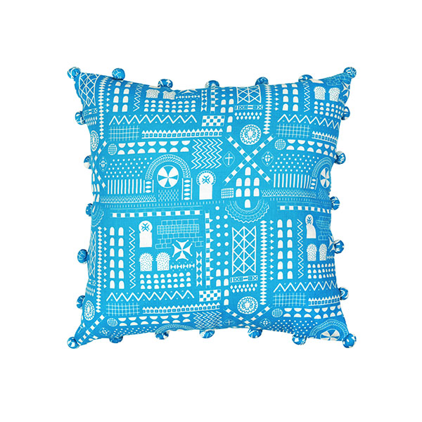Safomasi is presenting a wool rug, two cotton-linen cushion covers, a bedcover and a cotton-linen lampshade, all hand-dyed in Curiosity, for the ColourNext collaboration. “We do hand-screen-printing, for the cushions and the lampshade,” says Sarah Fotheringham, co-founder of Safomasi, “There’s a vibrancy that you get with that process… you get a slight variation in the colour in cotton-linen, it becomes very vibrant.” The patterns on the textiles were inspired be the founders’ travels to Cappadocia in Turkey, and frescoes and paintings they saw in the caves and churches there. Interestingly, will be the first time Safomasi is producing a rug in blue—and it will also be the first time pom-poms make an appearance on their cushion covers.