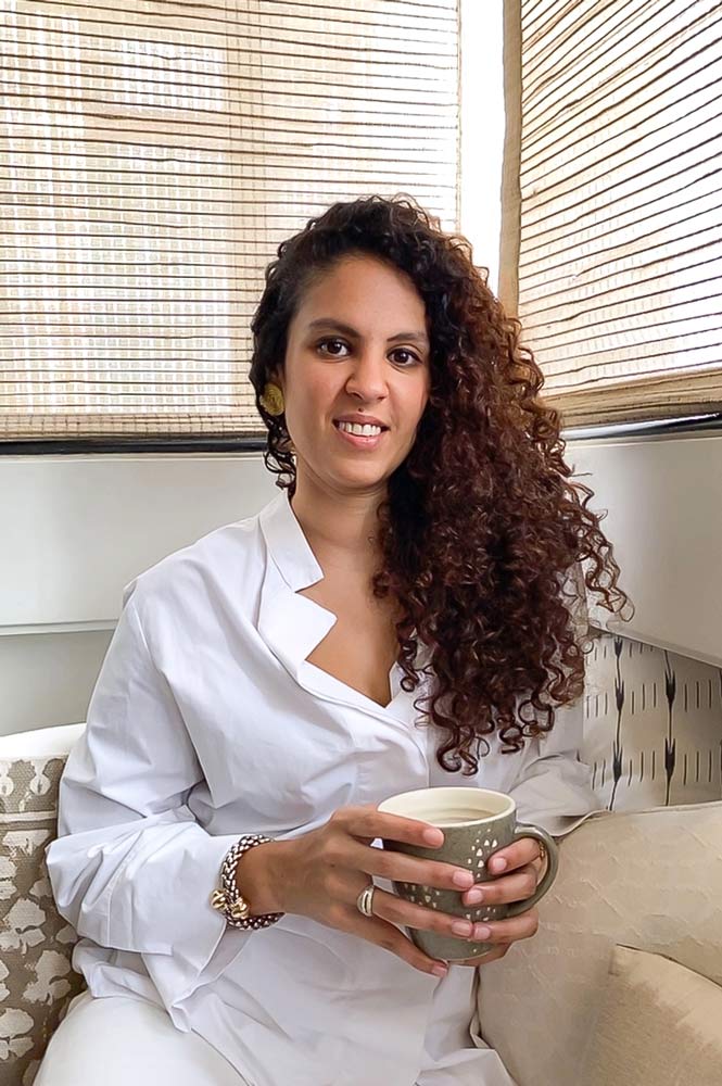 Shonali furnished the room by handpicking fabrics that brought the space alive. Two collections from the Royale x Pure range of furnishings resonated with the aesthetic of the space. The TATTVA collection features contemporary patterns in black and white with clean lines. The second one, IKIGAI collection, stems from a historical and cultural context. Shonali went with a neutral white sofa and layered it with black and white cushions made with the Weston Jade black, Meander Obsidian and Baxter Nero fabrics. The bar chairs too were upholstered in a similar fabric. For the accent chairs she used a rust coloured cotton-velvet fabric called Bakshi Russet. To finish the look, she chose a fabric called Pearo Zinia for the chairs, to add in a pop of colour.
