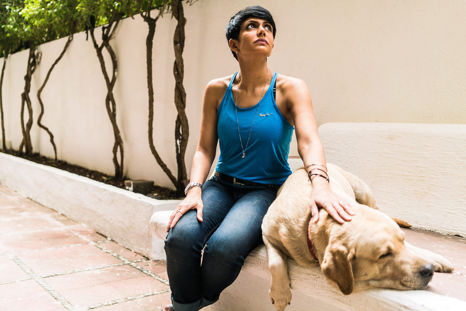 It’s easy to recognise this home even from a distance – a unique triangular house, right in the middle of a Mumbai suburb, with bold letters at the top spelling RaMa. That is how you know you’ve reached Mandira Bedi and her husband Raj’s house, and as soon as the gates open, out come her two dogs, curious as to who has come over for a visit. We couldn’t have asked for a better welcome.