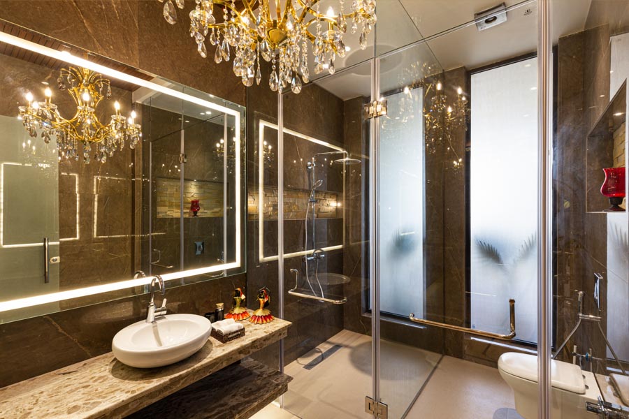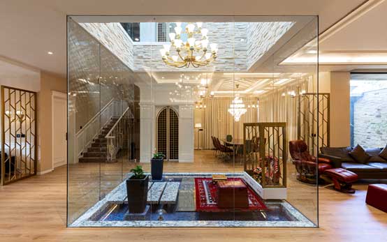 With so many interesting features, it might be difficult for one to stand out. However, there is a clear winner on the ground floor – the central, ‘floating’ puja room. Says Rajesh, “I had seen something similar at a friend’s house in Kerala and I loved the idea of a ‘floating’ puja room.” This area was inspired by traditional Indian architecture where one used to have a central open courtyard. Explains Udayveer, “In this case, we have enclosed the puja room in glass which is open to the diffused light filtering in from the skylight on the top floor as well as being illuminated by a grand chandelier. The flowing water features within the glass enclosure also brings out a calming, meditative feel.”