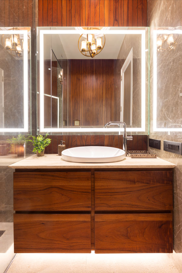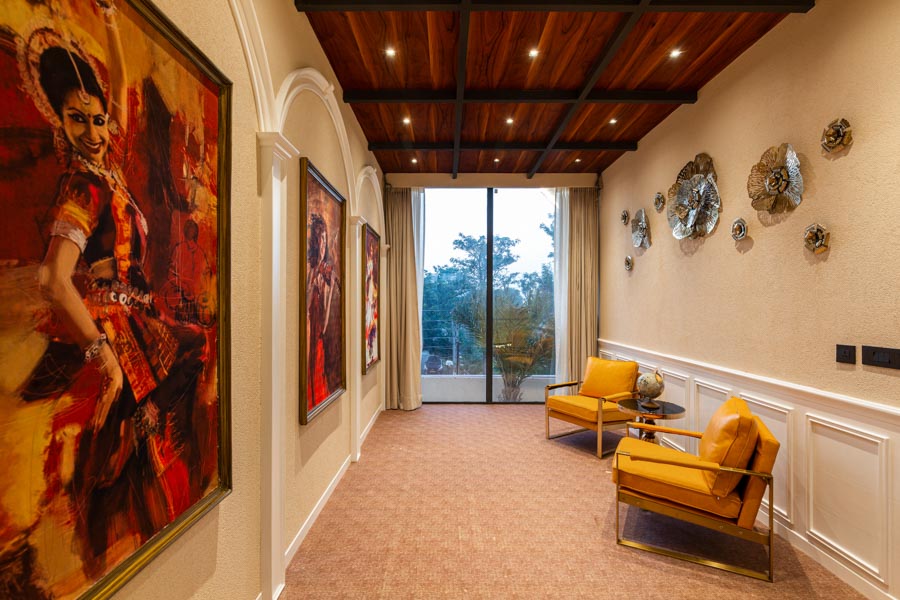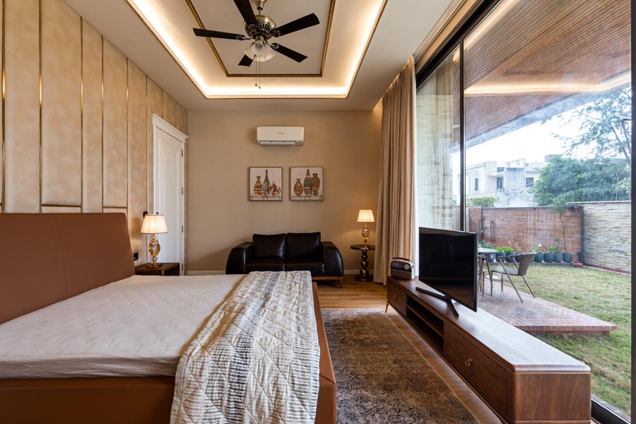 For the finishing touches, Udayveer focused on small yet impactful details. A date palm tree planted on the ground floor emerges from a cut-out in the first-floor deck and can be seen from the bedroom balconies as well as the first-floor landing. The bedrooms display traditional Indian metal art which highlights the walls and the ceiling. “I wanted to use a traditional lehenga with hand-embroidered gold work in some way. In the master bedroom, parts of the lehenga were used to frame the couple’s wedding portrait. I also separately framed the latkans for the guest room; adding memories to the home,” says Udayveer.