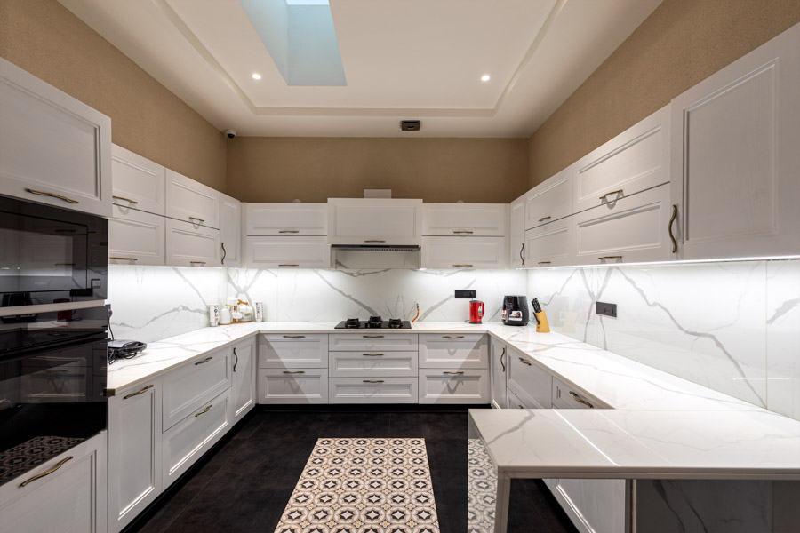 The layout of the ground floor is such that all the public areas are visually connected. As you enter the home, the central puja room steals the show. To the left is the formal living area that looks out over the front lawn. To the right are the open plan kitchen and lounge area. In front is the dining room which leads to the back porch. Subtly tucked away in different corners are a guest bedroom done up in muted shades and a second, private kitchen.
