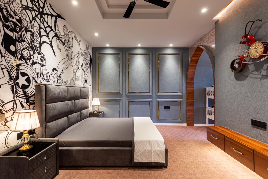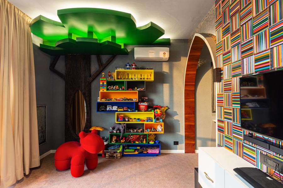 To design a bedroom for two young boys with different tastes Udayveer divided the space into two zones, each with a distinct personality. One area features a black-and-white superhero-themed feature wall against which stands a leather bed. Walk through the arches that connects the two areas, and you’ll find yourself in a world of bright colours. This partition wall here features sharpened colour pencils from the floor up to the ceiling. Simple white bunk beds are tucked into one corner while the opposite side is designed to be a multipurpose play area. The architect has decorated the areas above the Gothic-inspired pointed arches with colour pencil shavings pressed between glass, visible from both sides.