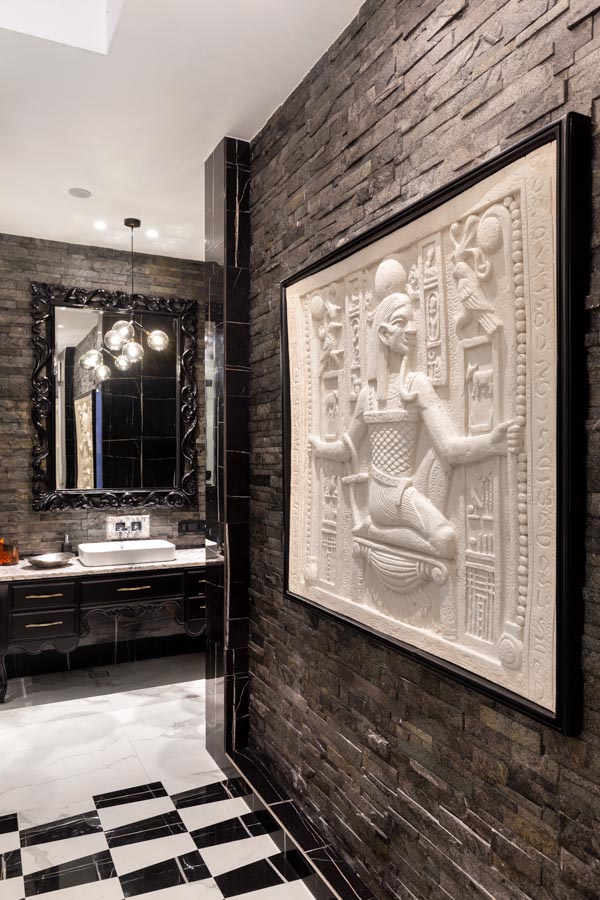 While on the ground floor, Udayveer used laminate wood flooring, the first floor is entirely carpeted. The large master bedroom is defined by soothing beige tones. Udayveer elevated the colour scheme by using textured paint on walls. A massive bed with a tufted headboard sits against a wall displaying handmade Nakashi mouldings – a traditional Indian art form. Tucked away is a walk-in wardrobe that leads to a dramatic black-and-white bathroom.
