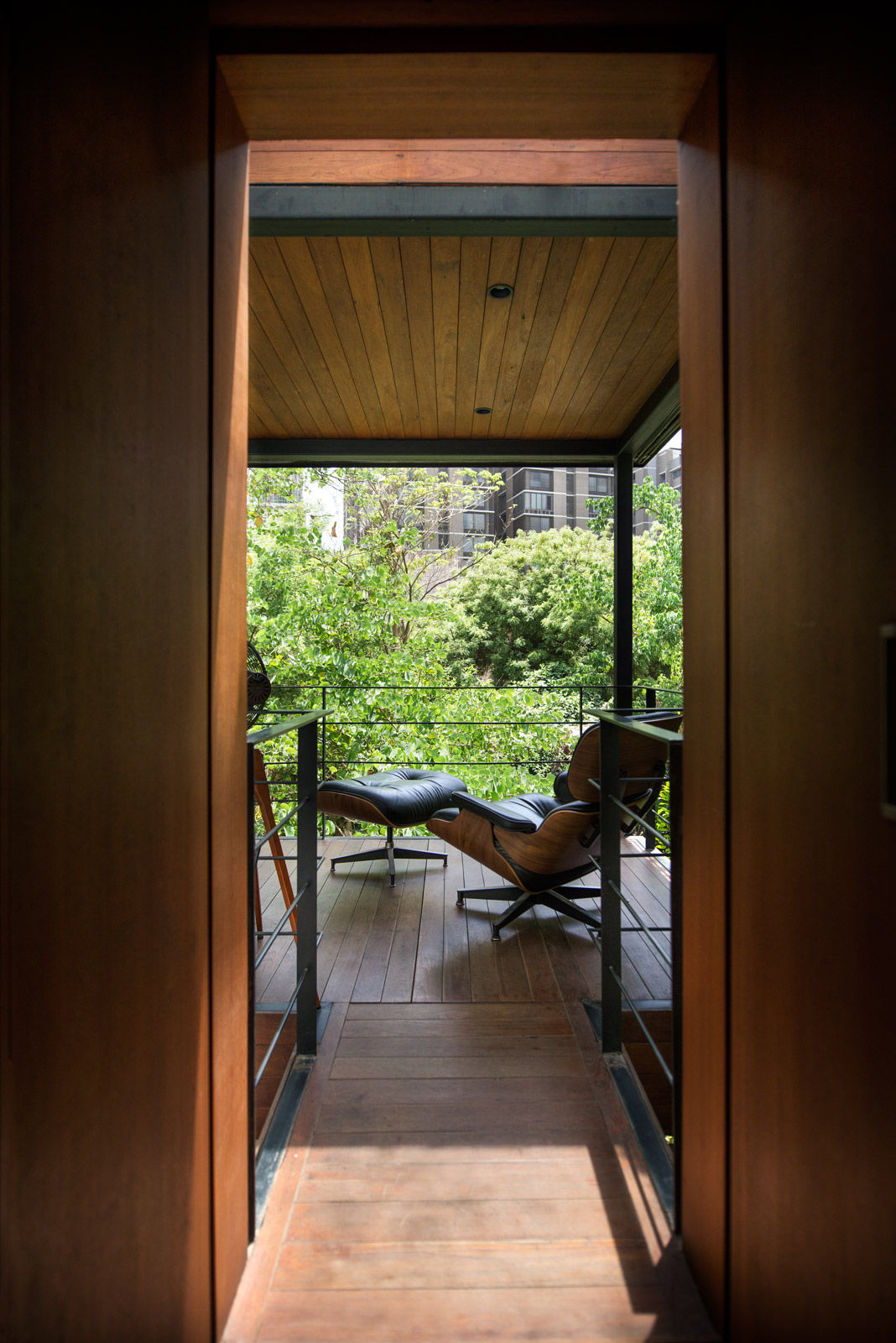 In this two-storey extension spread across approximately 830 square feet, the appearance of the wood, apart from the flooring, is as unexpected as it is ingenious. At the ground level, the extension has a living area and a small kitchenette just off the formal living areas of the main house. The sliding glass panels allow the entire space to be opened up, when weather permits. On the top, a balcony that can be accessed only from the master bedroom is at one end. At the other end is a “kitchen garden that is accessible via a stairway from the service area behind the house”. It can all be opened up, or shut completely, thanks to the “shading- and privacy-giving wooden louvres, which can move entirely over the facade. Both the wooden louvres and glass shutters are top hung with rollers and can be moved by hand,” explains Hoof. He considered, but rejected, mechanising this process as “it would have added bulk and required maintenance”. The whole space is air-conditioned as well, so you can enjoy it even in Ahmedabad’s summers with the louvres open to enjoy the light and the glass shut to keep out the heat.