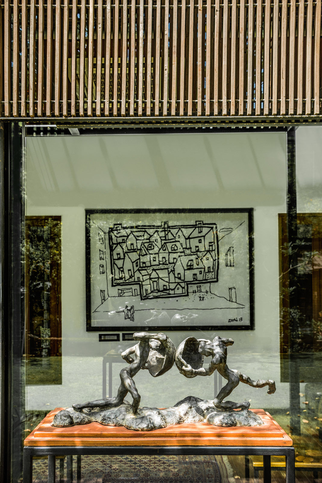 The result is a space that has been inserted seamlessly between garden and home, unobtrusive except in the conspicuous transformation it has effected on the way the Sinhas choose to spend their time at home—most of it in this extension. “The way the slats kind of overlap, the way the spaces feel inside, the quality of light—this is not something we could have imagined,” says Sameer. And in keeping with the impossible lightness of this space, the furniture has been kept minimal, sourced from the couples’ existing pieces accumulated over years of travel. Except, that is, for the hanging lights that Hoof custom-designed and a Doshi-signed serigraph of one of his sketches.