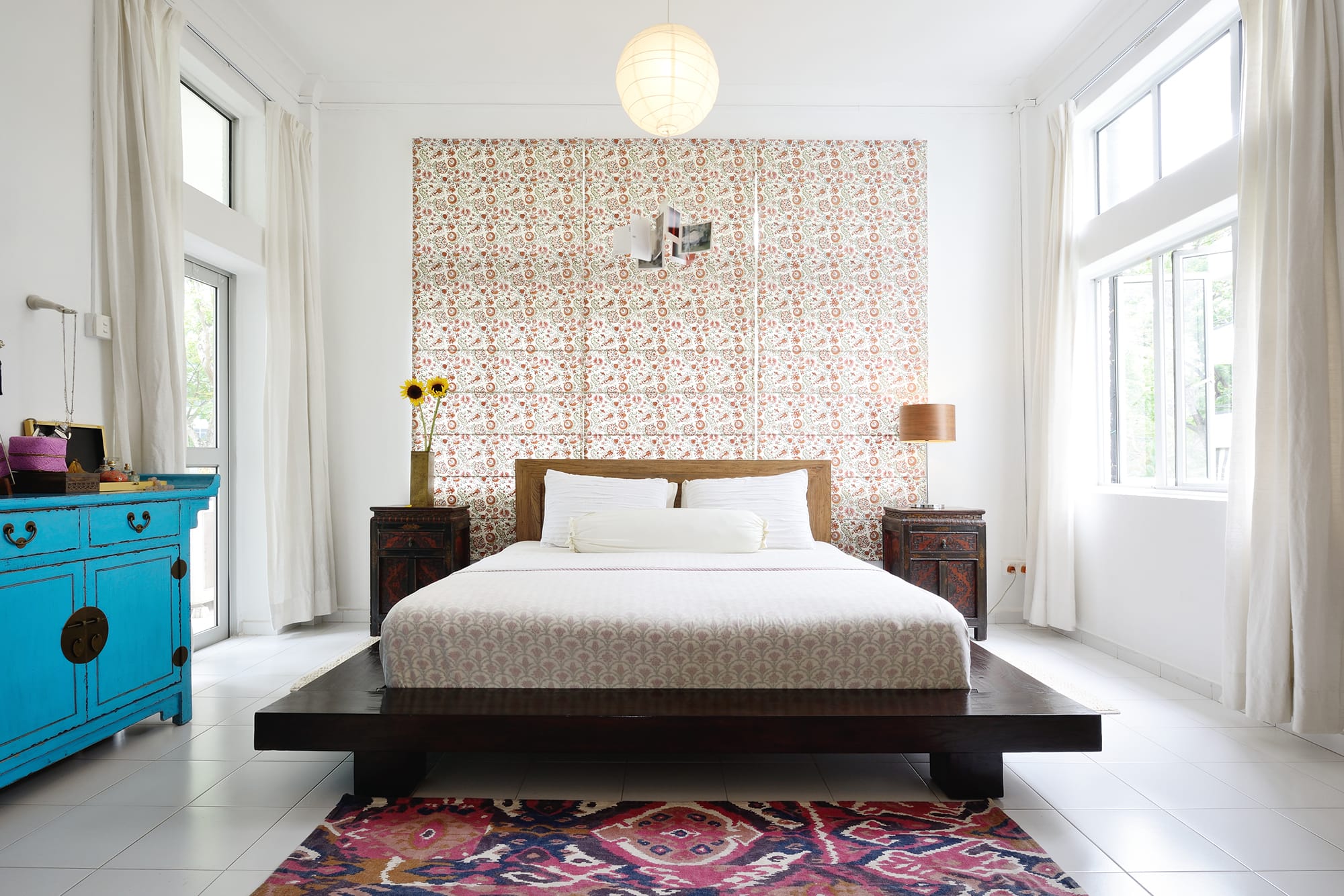 The apartment has an 11 ft high ceiling that along with the stark white walls and natural light, gives the apartment a sense of expansive space.
