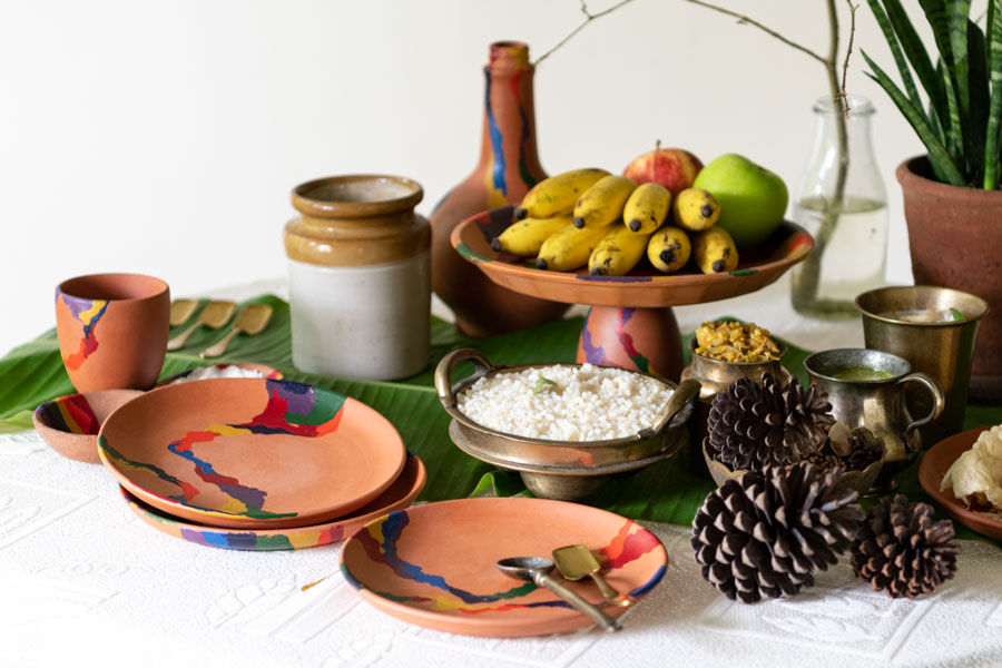 The traditional Kerala crockery has been used to add cultural context to the table. This includes a ceramic bharani and brass utensils. Along with this, they have used terracotta plates from their own collection to add a contemporary touch. This also blends in well with the other natural elements on the table. “Try to bring in various textures on the table, this adds a lot of character to the set up,” says Arun. They have placed the fruits on a pedestal. “If everything on the table is of the same height, it all looks bland. But the minute you place things at different levels, it becomes interesting to look at,” says Mohammed.