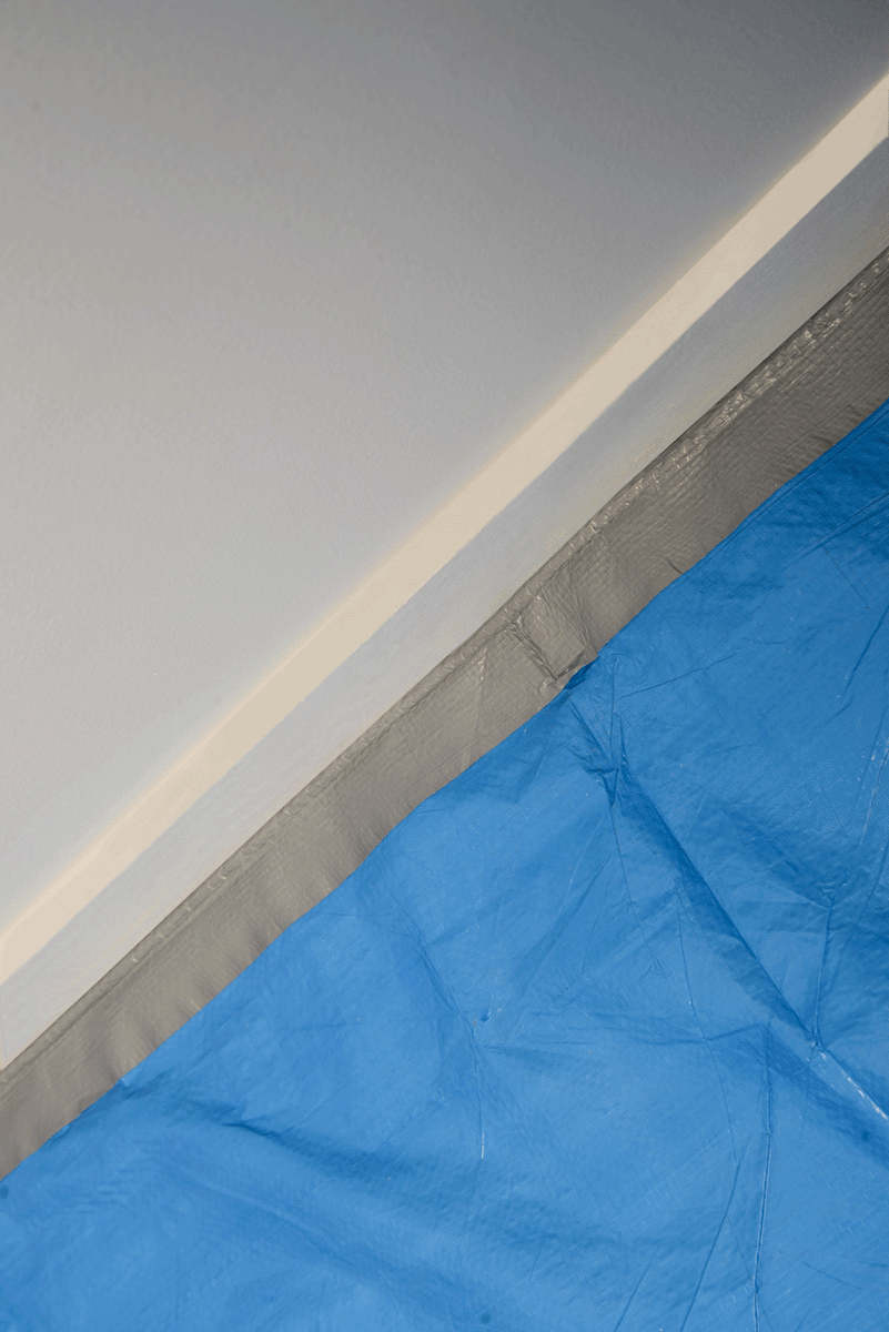 3. Cover the floor with a blue tarpaulin or plastic sheet and secure it along the edges with masking tape.
