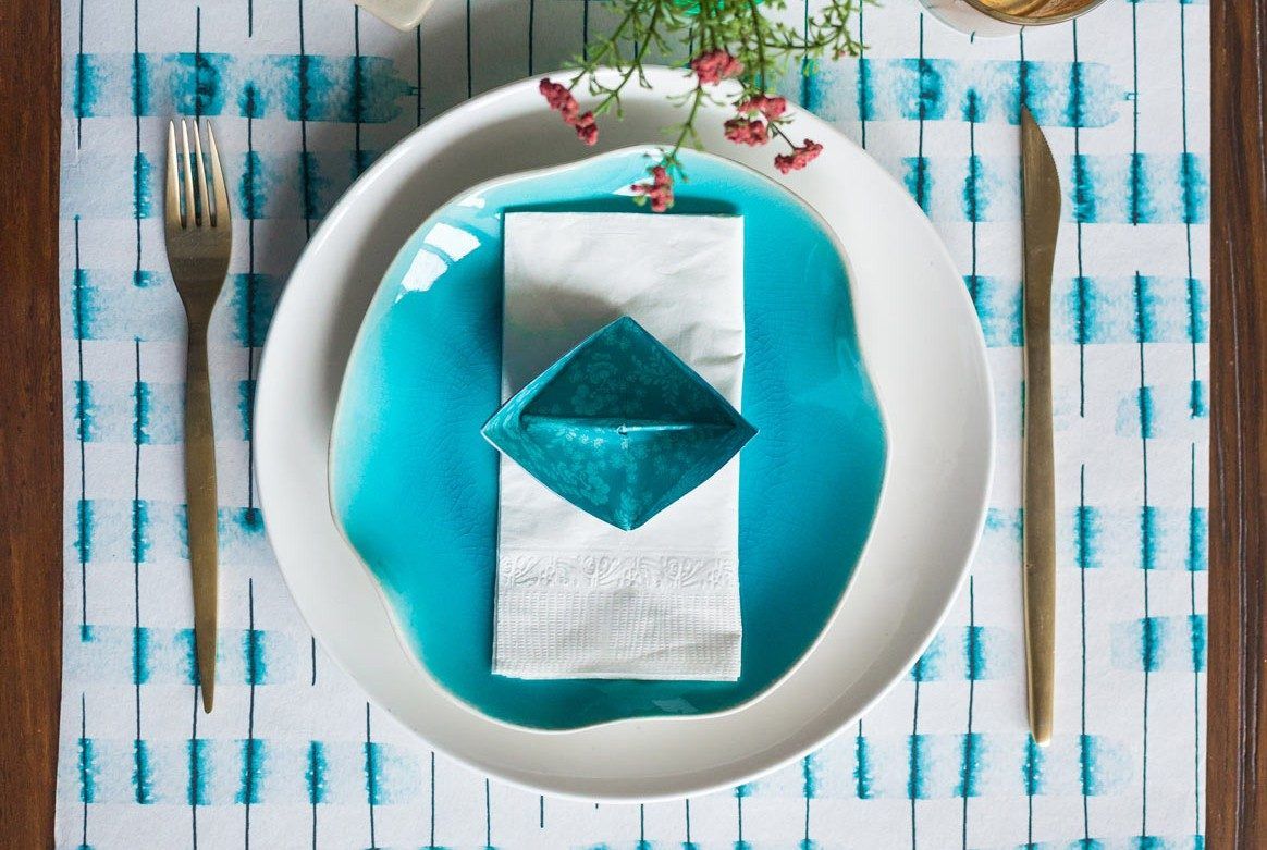 Given how unpredictable the weather has been of late, it’s only natural that our entertaining has moved indoors this monsoon. So while your team slugs it out in the kitchen, here are a few simple DIY ideas that will help you up your table setting this monsoon. Firstly, colours. Work with colours of the season – choose from ocean blues to cloudy greys. Instead of cloth table runners, work with sheets of paper, that way there’s no hassling about washing and drying later. Here we have used wallpaper samples from Nilaya by Asian Paints as the base to elevate the setting. Create a hero element, borrowed from the weather – be it a simple paper boat, a dainty umbrella fashioned from a doily or paper cut outs of clouds. And lastly, elegant flatware and serveware. This will help balance the whimsical elements on the table.