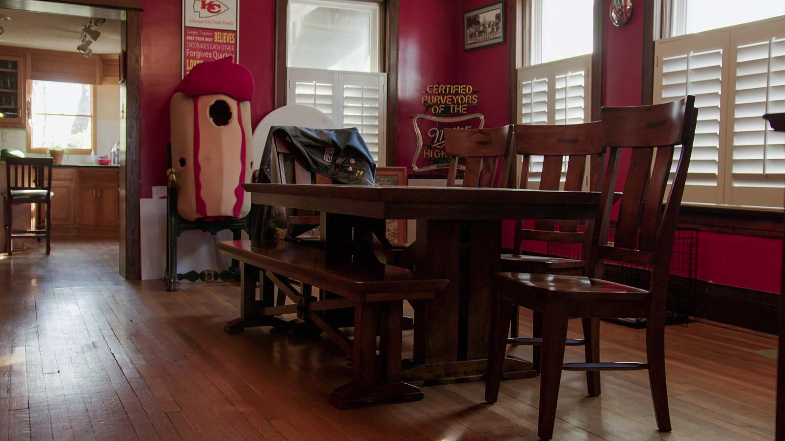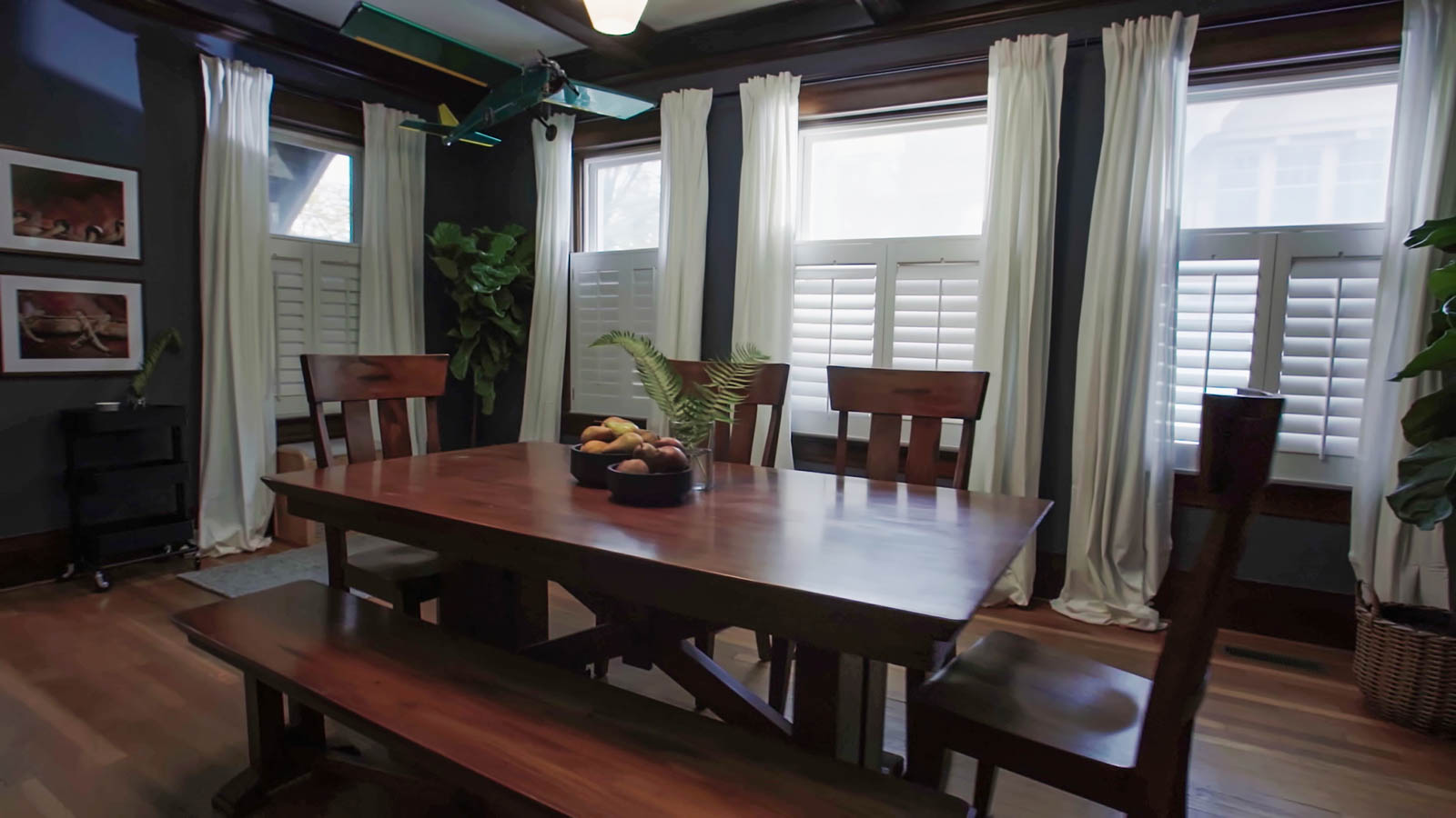 In Episode 3, Berk swaps dark panels for dark paint. He designs a den-like hunter green dining room with dark wood accents which has a moody quality that fits the home and people he’s designing for. The bedroom gets a Prussian blue makeover with light and dark wood accents and a light headboard.