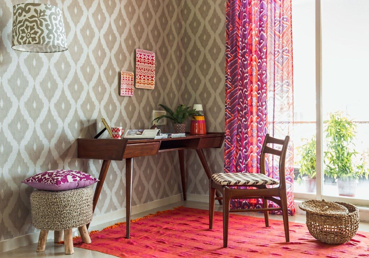IN THE PICTURE Clockwise, from Left to Right, Ikat Grey wallpaper from Nilaya by Asian Paints, Rs 3,999; Ikat Lamp Shade from IVY HomeStop, Rs 999; Montana Stool from The Rug Republic, Rs 4,299; Monsoon Forest Magenta Cushion from Freedom Tree, Rs 288; Cotton Woven Chaman Bed cover (used as rug) from Fabindia, Rs 2,490; Icon Chair from Baro, Rs 15,000 onwards Basket from Back to Earth HomeStop, Rs 899; Ikat Sheer Fabric from Freedom Tree, Rs 377; Large Trayerolic Tray (on wall), Rs 450, Small Trayerolic Tray (on wall), Rs 325, both from Home Town; Trenz Photoframe 5 X 7 gold from Orange Tree, Rs 879; Ikat Red Mug, Rs 199; Eden Vase, Rs 1,090, both from Home Town; Pink Glass Vase from HomeStop, Rs 399; Fern Planter from Pure Home Living, price on request; Nawab Desk from Highlight Living, Rs 40,000 onwards.