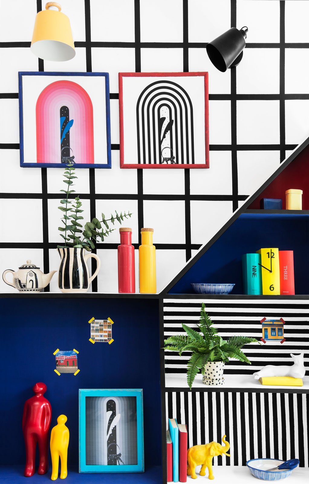 Against a background of a neutral room, this punchy coloured shelving goes from looking like your toddler picked out the colours to something more modern and reminiscent of the 1980s Memphis Design style. Give primary colours the leading role while letting the monochrome pieces support the final look.