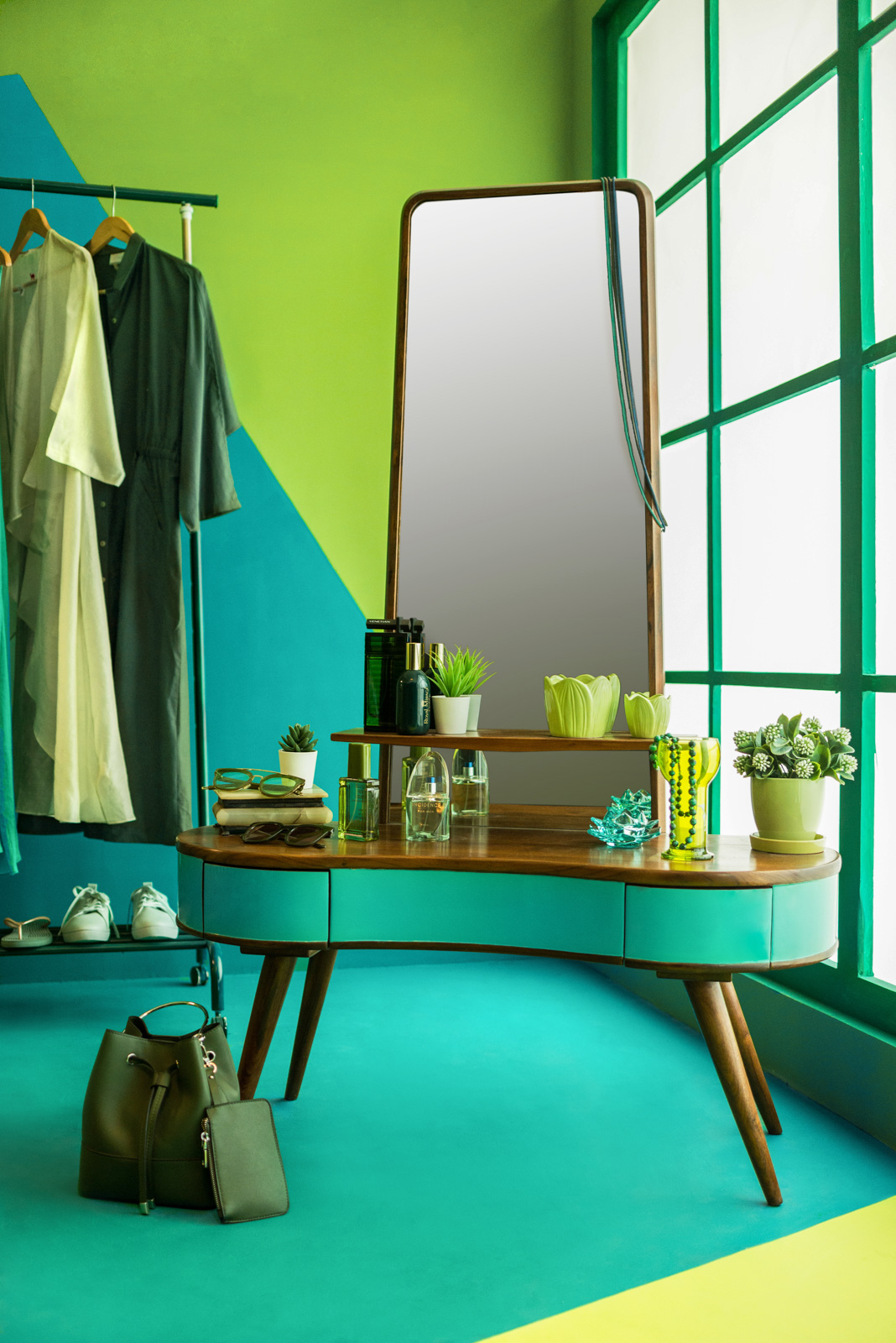 2. Use different textures and materials to separate the various shades of green; this way, each shade retains its individual identity while remaining cohesive with the overall colour palette.