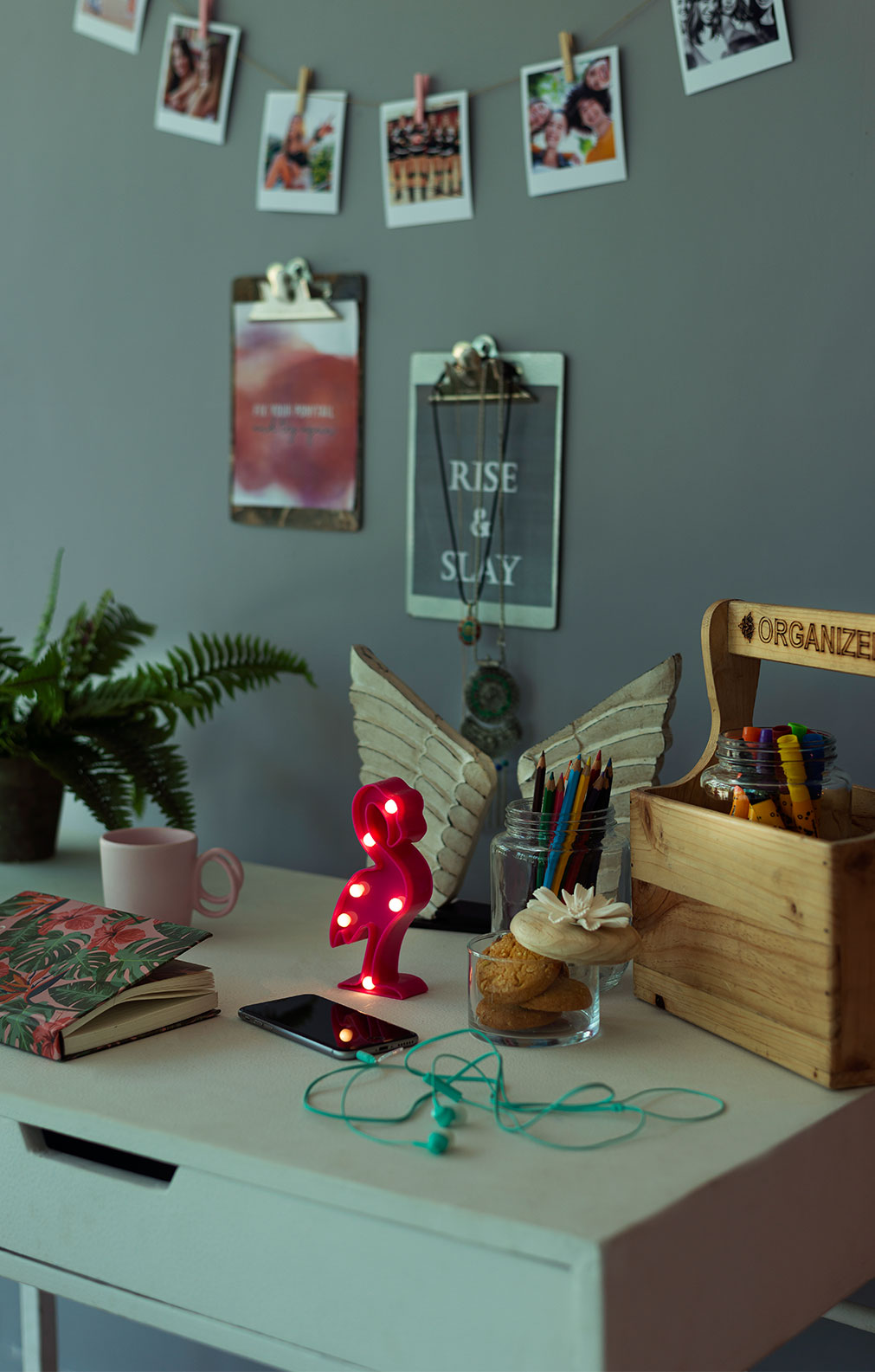 5. Make studying inviting by adding a lamp, a comfortable chair and knick-knacks. Add a plant to make things homey.