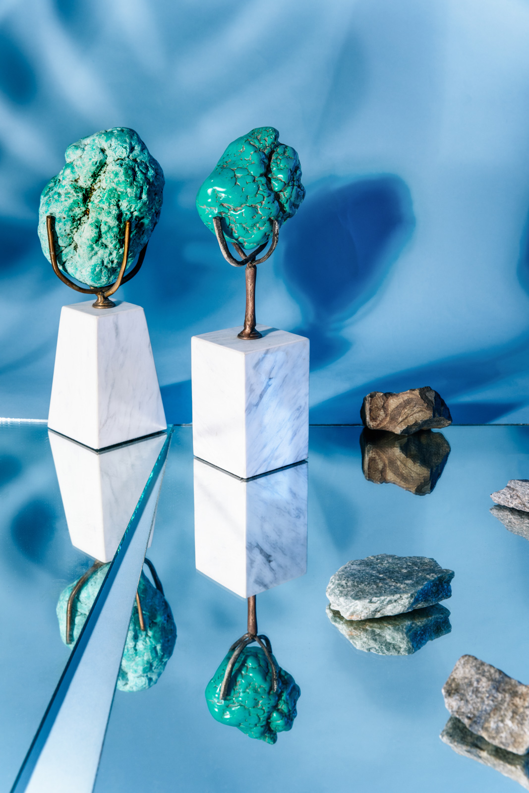These mineral-filled rocks or geodes bring in nostalgia (or millennia of the earth’s history), an aesthetic of cool and an element of mystical, healing energy to your home. On the left, the large geode is made of minerals—green apophyllite and green chalcedony with off-white stilbite; the smaller rocks on the right are made of the mineral amazonite.