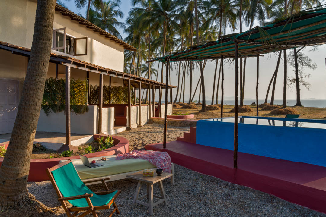 Repurposing is an all-day chant at Fernandes Wadi. Thakkar and Fernandes have used old grills as old window grills to support coconut screens between private and common areas, dressing them up with bougainvillea and ivy vines; an old water-storage tank has been turned into a dip-pool; old gate lamps have found a new lease of life as chandeliers; old Mangalore tiles, stripped off from the original roof to make way for insulated sheets, have been used to adorn the roof of the balcao; two casuarina trees on the edge of the property that were uprooted due to erosion were used to make shelves for the bathrooms and barbecue area. “Nothing is left to waste.”