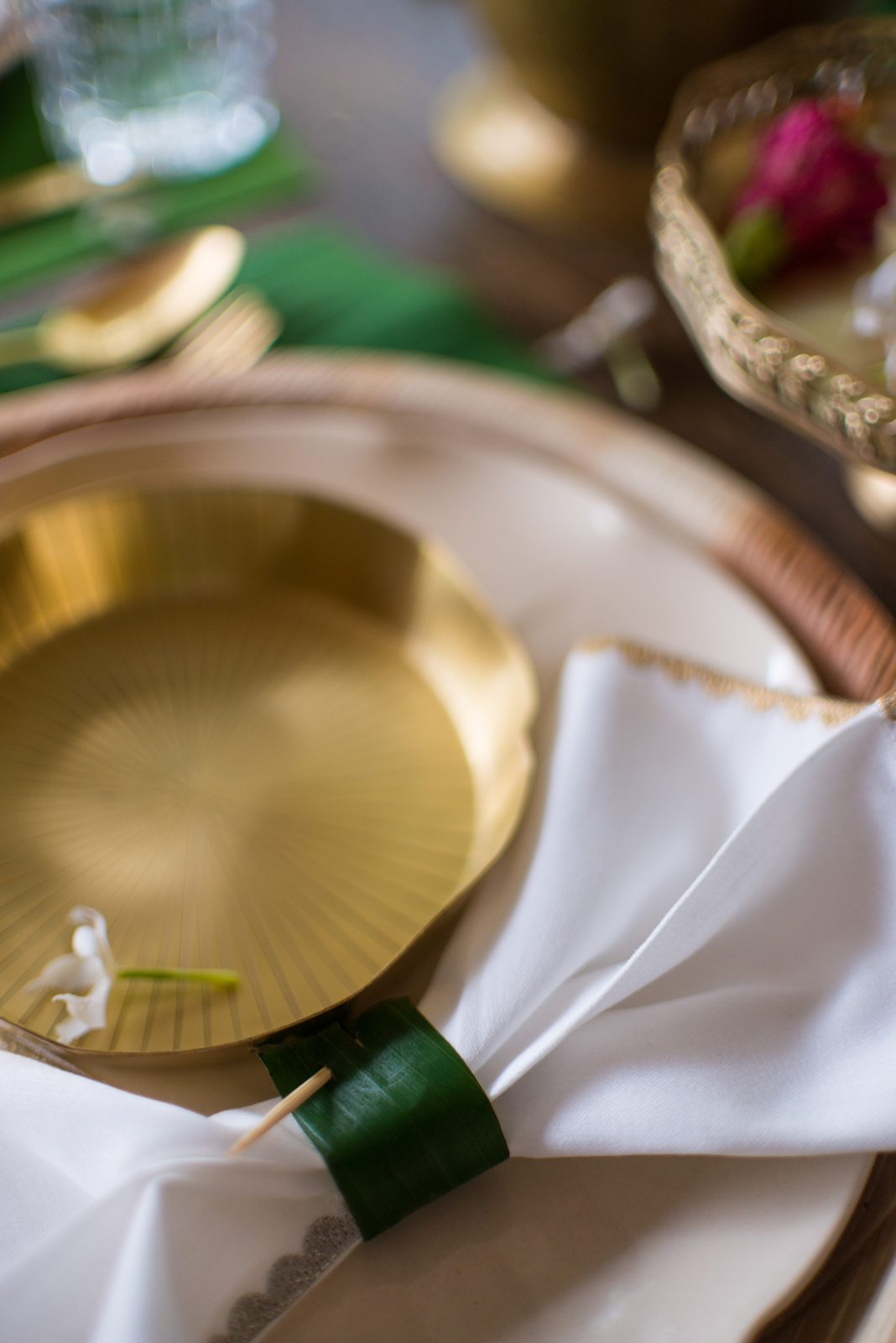 With banana leaf inspired reusable table mats, brass tableware and fresh flowers you can create a modern sadhya setting at home.
