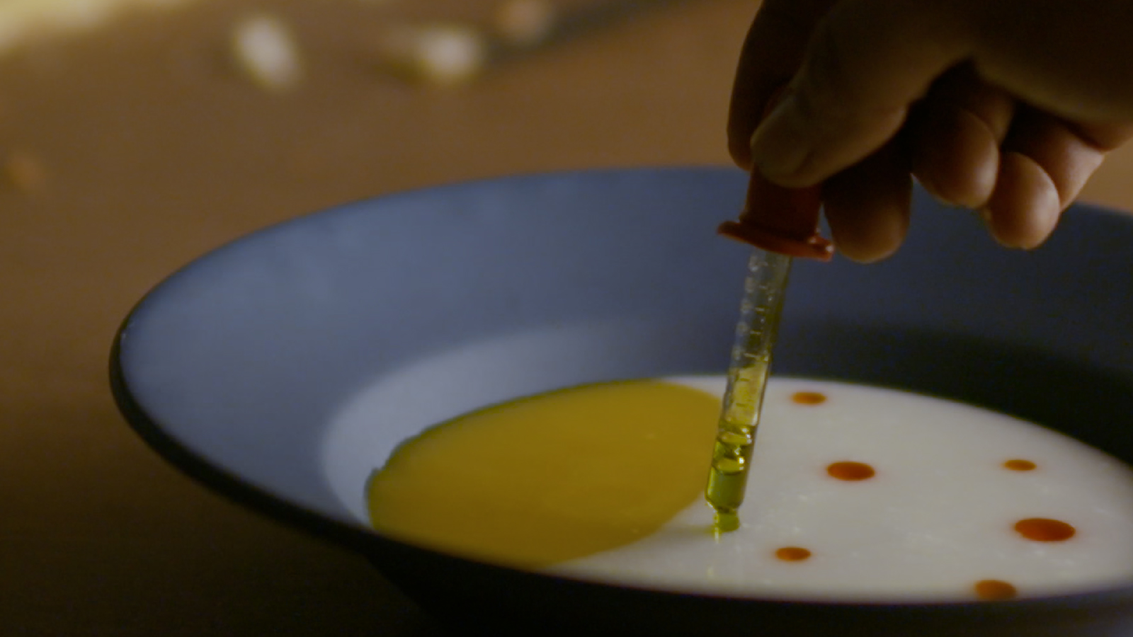 6. Pour the two soups into the bowl simultaneously to form a divided appearance. Drizzle with the curry leaf oil.
