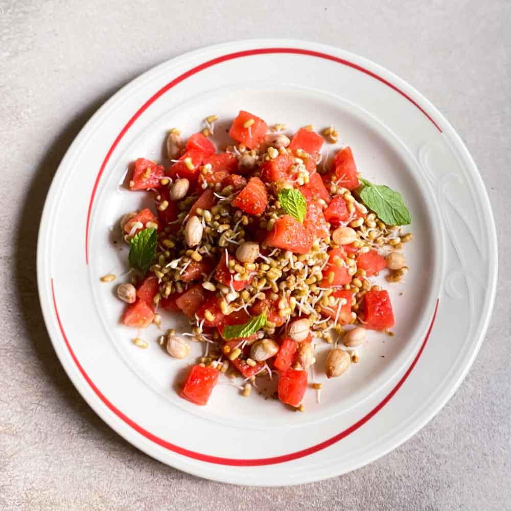 Tip: this salad tastes best chilled, if you haven't kept your watermelon in the fridge overnight, place the watermelon & matki mixture in the freezer for half an hour before combining with the dressing and serving.