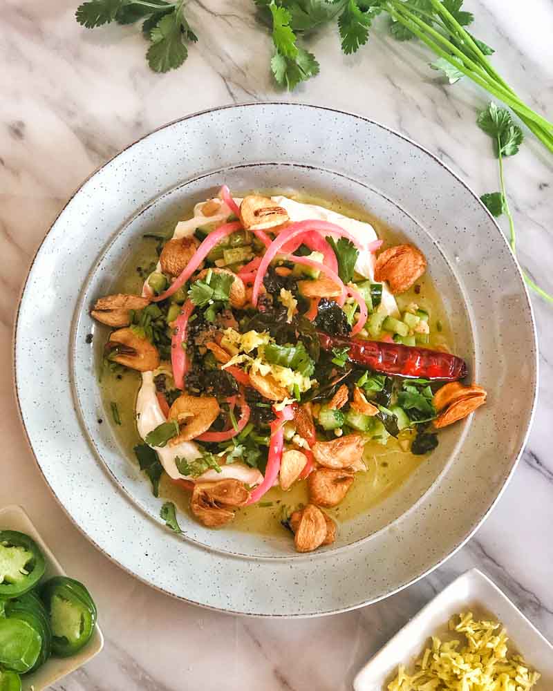 The inspiration behind the recipe: “This delightful summer salad is a play on the traditional Maharashtrian Khamang Kakdi, enhanced with the creaminess of Greek yoghurt, and the crunch of fried garlic. It is healthy and indulgent and makes for a great, quick summer lunch. Crunchy cucumber, roasted peanut and the zing of chilli give this plenty of flavour, without any of the fuss! Make sure to use a good quality ghee, as it does add to the flavour. And preferably Greek yoghurt, which is thicker and has more protein as compared to regular yoghurt. If you use regular yoghurt, this will be more of a raita, and less of a salad!” (Instructions for home-made Greek yogurt included in the recipe).
