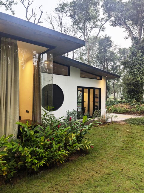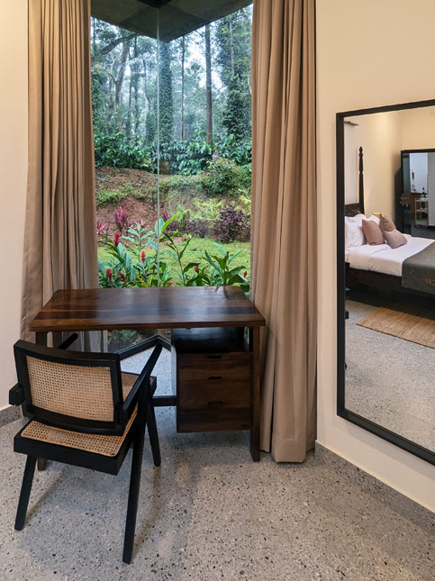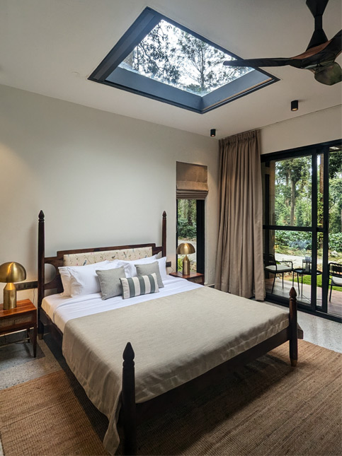 The home is now divided into two independent 3-bedroom units—Sunnyside and Woodside—which can also be booked together as a 6-bedroom estate. Skylights, glass panels, and neutral interiors allow nature to remain the focus. Sunnyside features a more contemporary design with elevated decks and views of the Palani Hills, while Woodside retains more of its original structure, including a wood stove fireplace and garden-facing passageways.