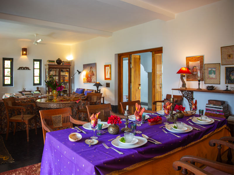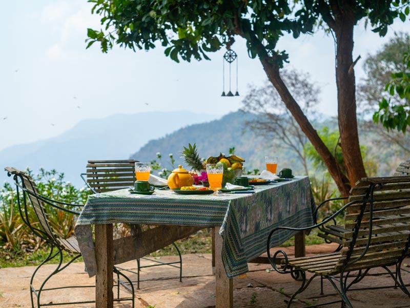 The pace is unhurried, and the food is simple but thoughtfully prepared. Meals are home-style and seasonal, with most ingredients either grown on the property or sourced locally. Breakfast is served outdoors—usually fruit, fresh bread, eggs, and a South Indian special. Dinner is usually a three-course European menu.