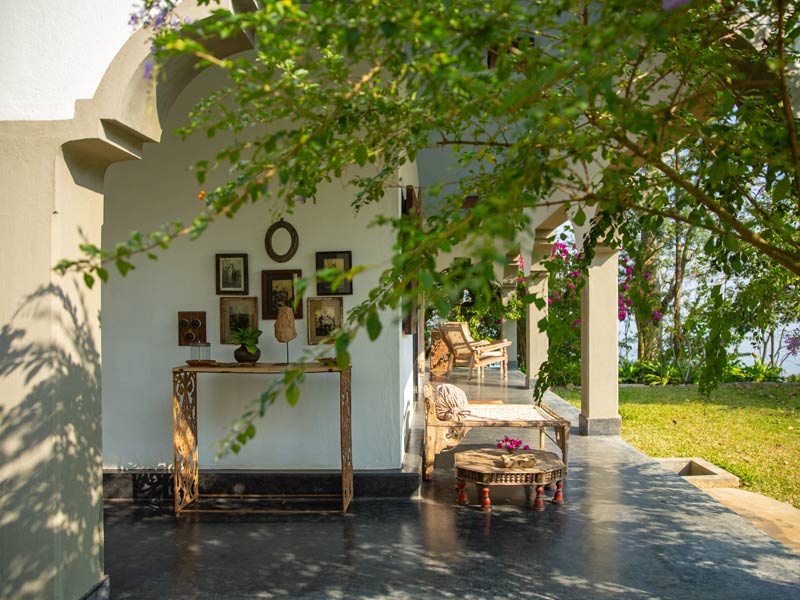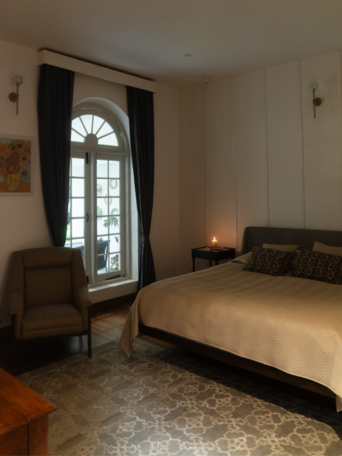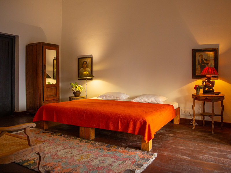 The main house has two suites—one on each floor—each with its own living area and a verandah. A second adjoining block, built in harmony with the original structure, houses the hosts’ residence. Traditional techniques like egg-white plastering (once used as a natural moisture sealant) remain intact, and most original materials were retained during restoration.