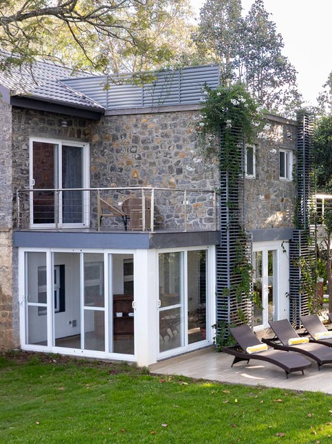 Earthsong is a three-bedroom villa set in a clover-leaf layout around a central courtyard, with large bedrooms, a lounge, and a covered deck. The villa includes a heated plunge pool, and a widescreen movie projector for outdoor cinema evenings. Birdsong is perched higher up the slope. Both villas feature skylights, floor-to-ceiling windows while seating nooks, patios, and shaded verandahs are designed to bring the outdoors in.